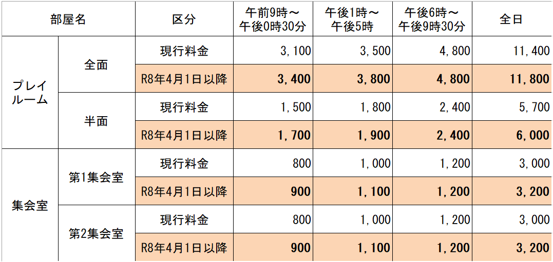 公共施設の受益者負担の適正化を図るため、以下のとおり施設使用料の値上げを実施します。