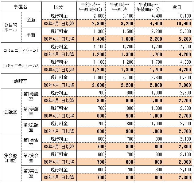 公共施設の受益者負担の適正化を図るため、以下のとおり施設使用料の値上げを実施します。