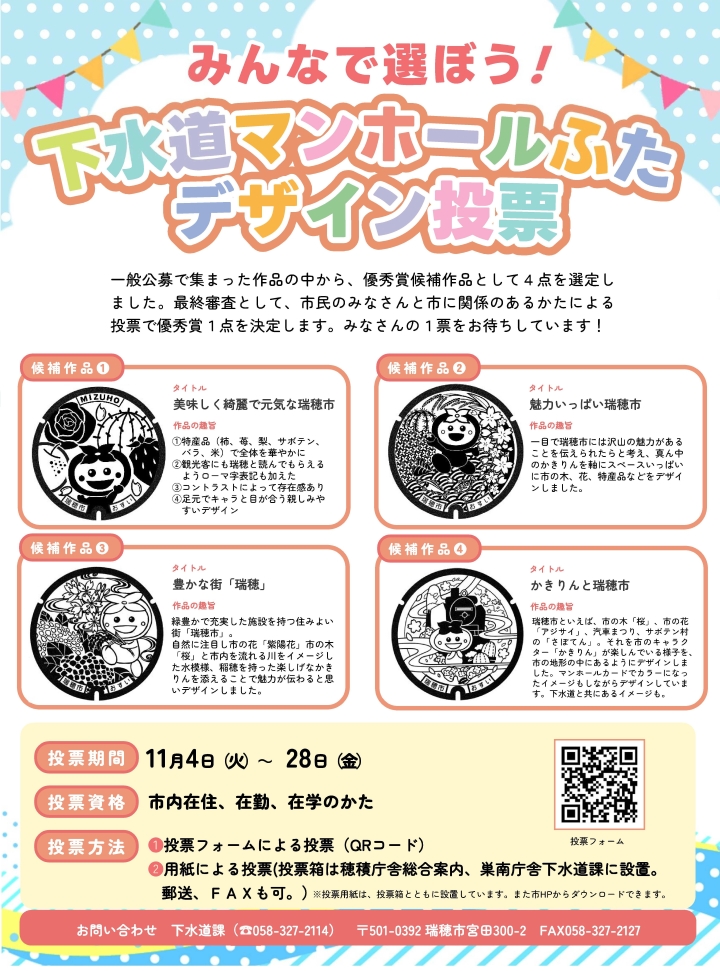 瑞穂市の公共下水道で使用するマンホールふたのデザインを決定するための投票を実施します。